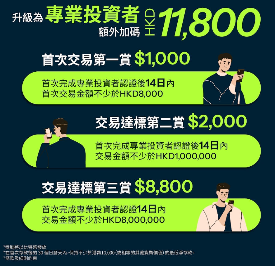 首次成功認證為專業投資者,並於取得專業投資者資格起14日內,完成至少一筆單筆價值不低於HK$8000(或等值外幣)的數字資產交易